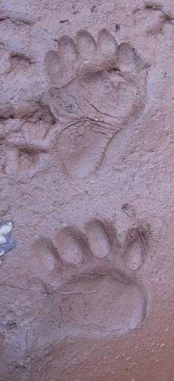 The next day I called Ann, a friend way into tracking and primitive skills, and we spent a couple hours peering at the crazy accumulation of prints alongside three of these pools, confirming my original hunches with the careful questions and comparisons of true tracking. There was a wild tangle of prints stretching along fifty feet of canyon floor, including an enlongated smoosh-print where the bear came down from the steep rocky slopes above. As we prepared to leave, Ann paused and turned our attention to imagining the print-makers wandering along the water…..