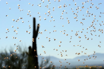 Yesterday morning the front yard bloomed with tiny tinkerbells, shimmering in the sun. First a few, then dozens, probably hundreds at a time, angling up and across the yard, swept along by a light breeze. What could it be? I first grabbed the binoculars by my side, to see if super-vision would help identify them, but they moved too fast. Walking outside and letting them fly toward and over me didn’t improve matters: they were so small, all I could be sure of was that they had four long slender Tinkerbell-ish wings, two on each side. But who were these wings carrying?