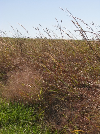 Here, at the bottom of the sky, rolling hills blanketed with supple grasses shimmer under a day-long caress of the hundred-mile winds of the plains. On a nearby slope, nearly backlit by the mid-day sun, large-scale patterns show the wind moving steadily left to right. Yet within this flowing motion are countless smaller and constantly shifting shimmerings, bright patches within the larger patterns, slipping and sliding across the hills: expanding disappearing returning trembling. This play of light is dynamic and detailed, riveting and subtle to the very edges of perception in ways that call to mind the ionic exuberance of the northern lights.