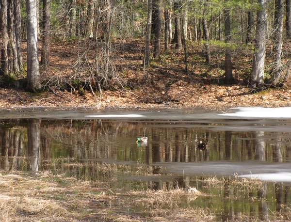 And so it is. Water pooling atop saturated soil, bogs softened, filling and spilling across woods duff into yards-wide mini lakes. The pond spreads to fill its little clearing, even as ice lingers; one of the ducks steps up onto this milky-white remnant to stand and stretch with a patti-pat-pat of wing slaps. The others graze, bottoms-up in turn, on greenery sprouting from the mud a few inches below the surface, a variegated mirror laced with dark and bright reflections of tree trunks on the far shore, their bare twigs now hissing in a passing breeze; beyond, a hundred-foot pine tosses to and fro with a roar of its own. The warm wind plays in the woods all around, enlivening the space with a finely-honed sense of rhythm and depth: airy fingers brushing through a cluster of pines at the end of the pond, setting them astir. . . and now caressing a bushy high crown directly overhead into a throaty sigh.