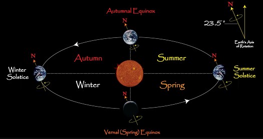 Surely you remember the basics: our northern hemisphere tilted toward the sun in summer, away from the sun in winter, and momentarily sideways to the sun at the spring and fall equinoxes (the tilt remaining constant in space, the north pole always pointing at distant Polaris). But how do these moments in the life of the planet look and feel from the vantage point of a human body in the noontime sun or under the slowly-turning panorama of a starry night?