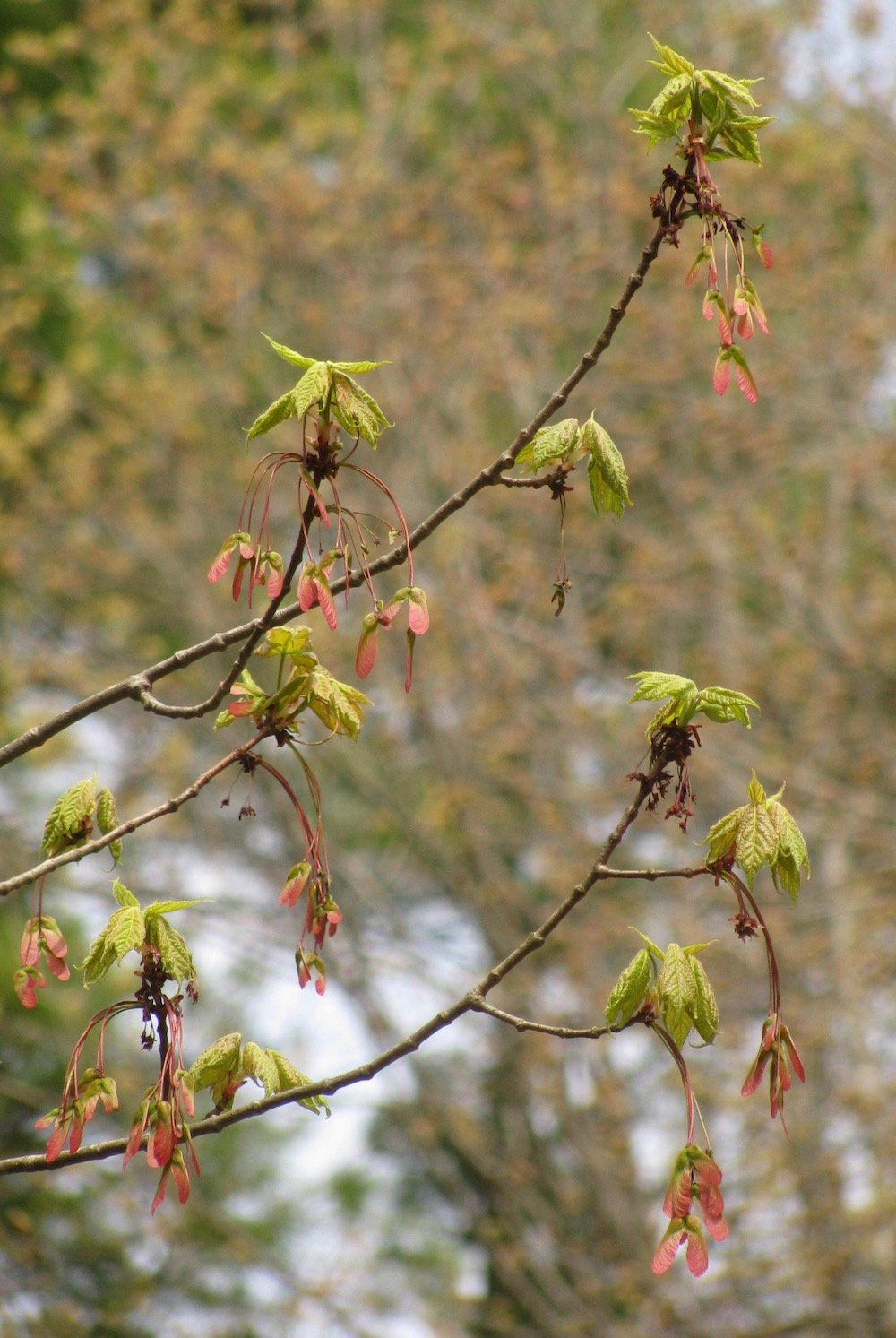 In the near- to middle-distance, across a meadow while on foot or alongside the road when driving, the diversity of forms and textures is most striking—and it’s here that spring most dramatically out-dazzles fall. While the endpoint of nearly all that’s now bursting forth will be quite similar (deep green leaves filling the space in and around all the trees and bushes), for these first few weeks, our view into and through the woods is a jumble of radically different shapes, sizes, and structures. Leaves, of course, at every stage (bright and tender first shoots, drooping rust-tinged youngsters, and stiffening-up, nearly mature greens), but also tree-flowers—some soft and droopy, others in compact bunches, and a few elaborate and brilliant cascades—and some early seeds as well, especially the red maple wings that add their bright touch to the end of this spring emergence, in the same way their flowers first speckled the canopy while the season opened. Often, new green leaves are tucked right up against flowers or seeds, creating a temporary and eye-catching contrast in both color and texture.
