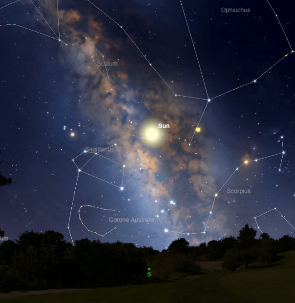 This shortest-day, lowest-sun, backward-tipped moment is not only a touchstone of the seasonal cycle. It’s also—amazingly and coincidentally—the turning point of our Galactic Year, for the winter solstice portion of Earth’s orbit around the sun happens to take us through the place in space that lies on the far side of the sun from the center of the galaxy. So today—and for the week or so before and after solstice—the Galactic Heart sits nearly directly behind the sun in our winter sky; the Milky Way’s glorious splash of diffuse light, that starry trail that on summer nights draws our spirits out into the largest of our visible bodies—the galactic body—is today shining invisibly alongside the sun, and for a brief moment at midday this Galactic Heart and the Solar Heart meet our hearts as each local landscape in turn spins at twelve miles a minute across the sunward edge of the earth to face them.